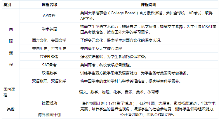 科学的课程体系开设AP课程、新托福融入英语教学、国际课程代替高中学业水平测试,满足多元化学习需求,已形成鲜明特色的国际课程体系与中国课程体系的优势互补。