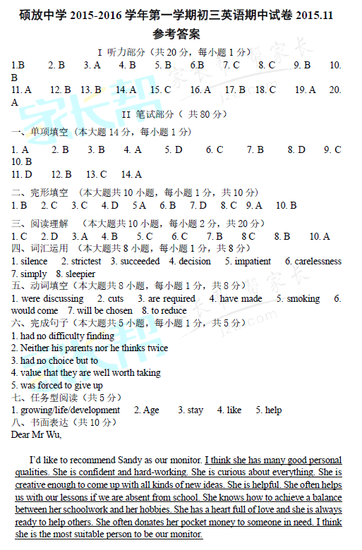 无锡市硕放中学2016届九年级上学期期中考试英语试题答案(3)
