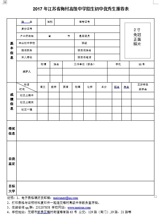 2017无锡梅村高中自主招生信息采集报名表